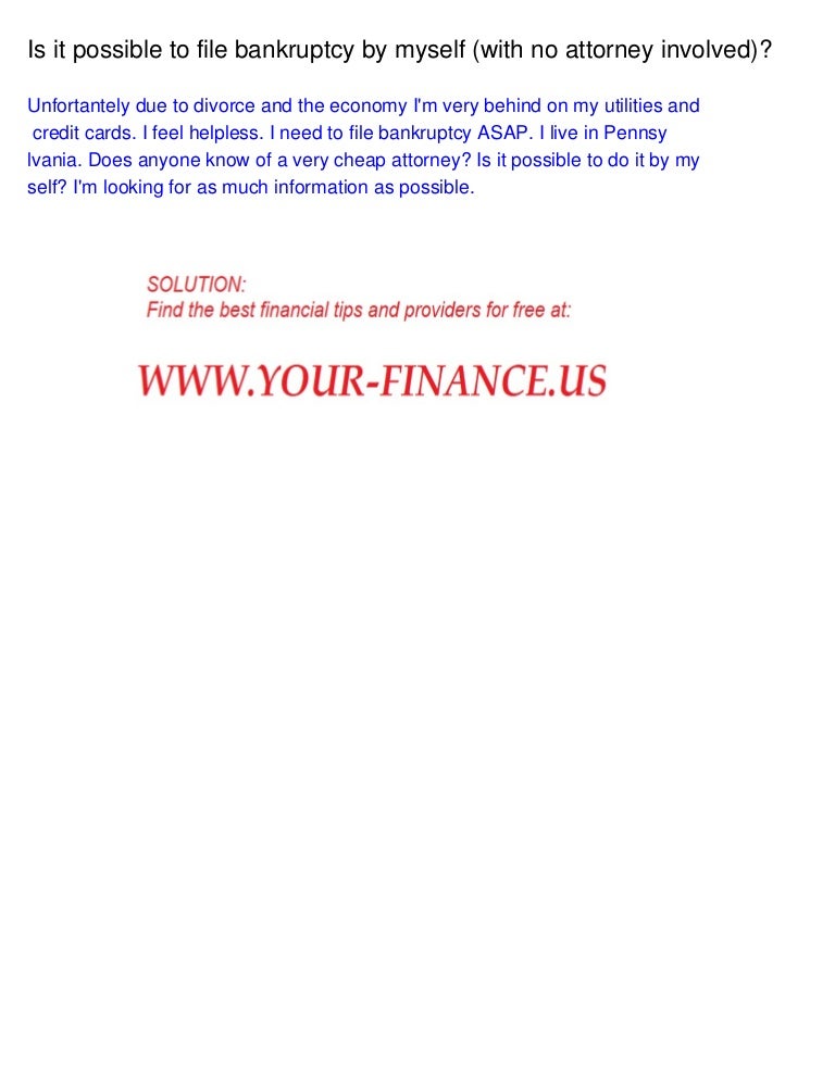 If you are considering bankruptcy one of the first questions you may have is whether you can file for bankruptcy. Where do i file if i haven't lived in the same state or district for the last six months? Bankruptcy law is complicated and the courts do not cut you any slack if you are not an attorney. Filing for bankruptcy without the assistance of a licensed bankruptcy attorney is usually a bad idea. So any suggestions on filing myself? This is what you should know. Many landlords will check your credit before they approve you for a lease arrangement. Bankruptcy eligibility is not a quick yes or no answer, and in fact requires a thorough. Can i file a bankruptcy by myself? Can filing bankruptcy stop bill back to top. Many people know they must file bankruptcy or a proposal but keep putting it off hoping. Will they come after her? The trustee estimates that the costs of sale and her commission will total $22,000.